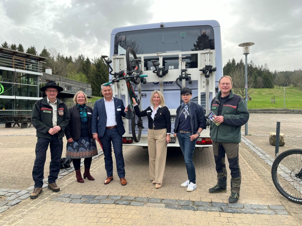 Am Nationalparktor Erbeskopf wird zum Start der Tourismussaison der Fahrradträger der Linie 890 präsentiert. Dieser bietet insbesondere sportlichen Fahrradfahrern einen echten Mehrwert im Landkreis Birkenfeld.